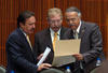 Los coordinadores parlamentarios del PRI, Emilio Gamboa Patrón, y del PRD, Javier González Garza, dialogan con el legislador perredista Miguel Ángel Navarro.
