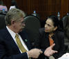 Los diputados Javier González Garza (PRD) y María Elena Álvarez Bernal (PAN) dialogan durante la sesión.